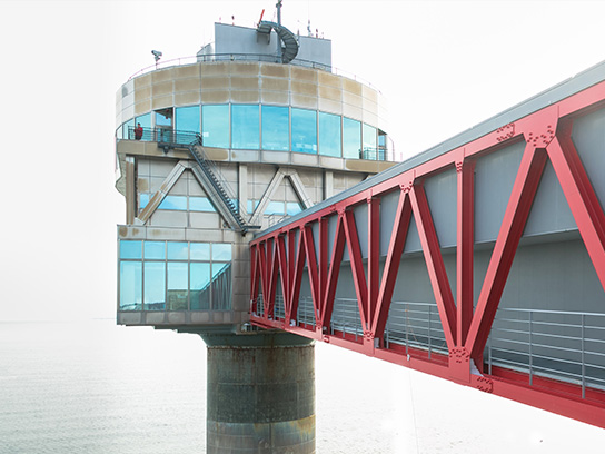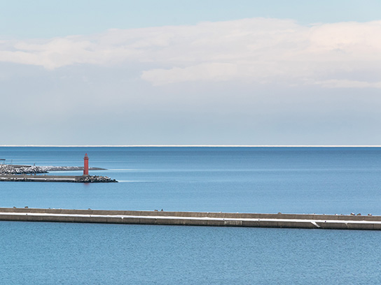 そんな流氷の景色を楽しむことができるのがオホーツクタワー。海岸から約1kmの沖合に伸びる防波堤の先端部に建つ、世界初の氷海展望塔です。洋上部分4階建(4階、関係者のみ)、海中部分1階からなる観光と研究観測の両面を併せ持つ施設で、3階の展望室からは海上の景色が360度のパノラマで楽しめます。
