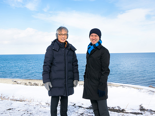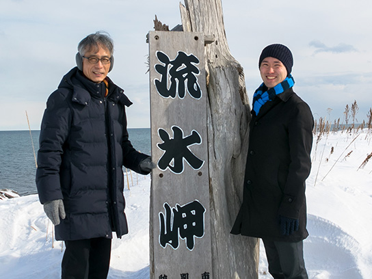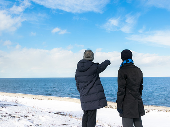 オホーツクタワーから海岸沿いに車で20分程北上すると、「流氷岬」と呼ばれる海岸があります。ここは浜辺なので、流氷が接岸すると、直接触れることができます。この日はまだ接岸前だったので、遠くの海上に流氷がやってきている様子を見ることができる程度でした。後日、接岸した後の写真をご提供いただいて拝見すると、オホーツクタワーの周りも景色が一変してしまうのには驚きました!