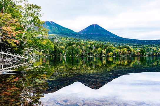 阿寒湖の東側の雌阿寒岳の西の山麓にある湖が「オンネトー」です。オンネトーとは、アイヌ語で“老いた沼”“大きな沼”といいい、湖の色が季節などによって変化することから、五色沼ともいわれます。雌阿寒岳の噴火で川が堰き止められた湖で、湖水が酸性のため、魚が棲むことができず、ザリガニとエゾサンショウウオが棲息する美しい湖です。周囲を深い森に囲まれた湖畔からの眺めは、とても神秘的。湖越しに望む雌阿寒岳と阿寒富士の並び立つ絶景は、静かな湖面にも映り込んでいます。