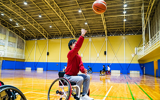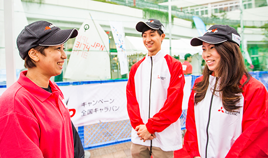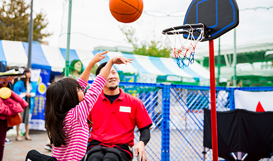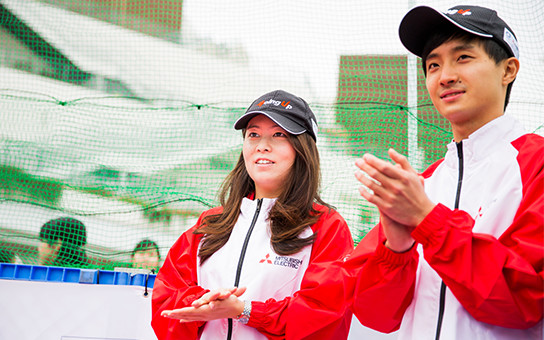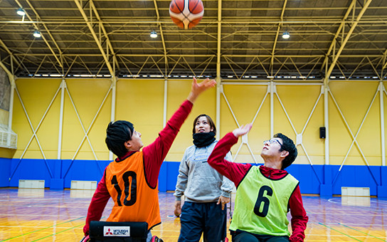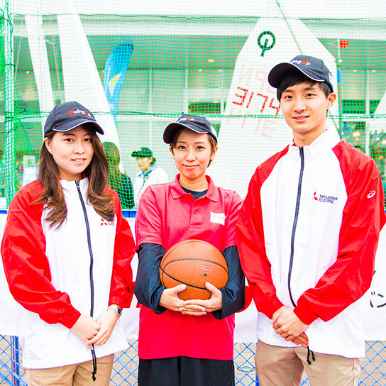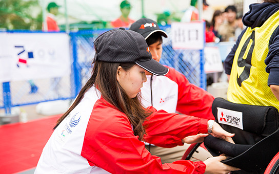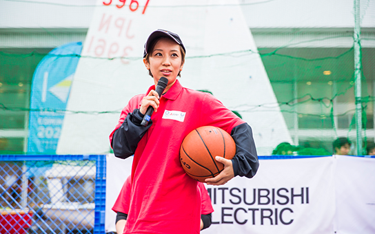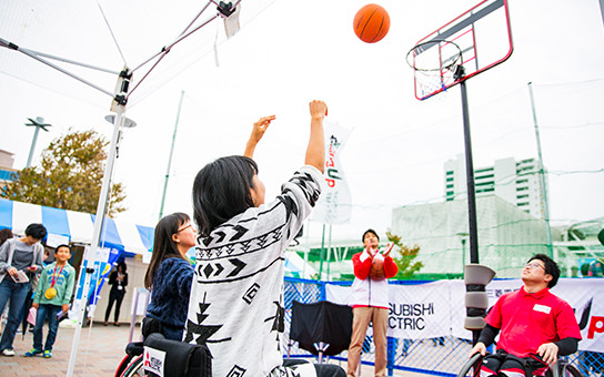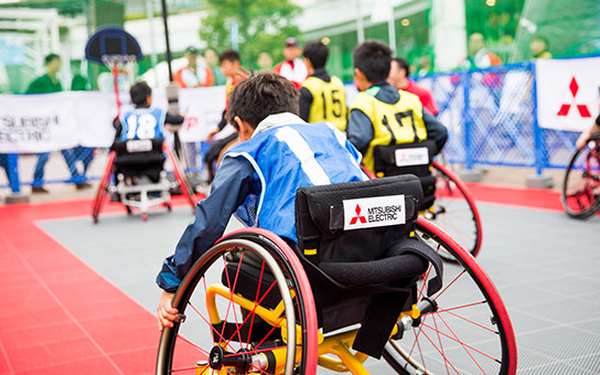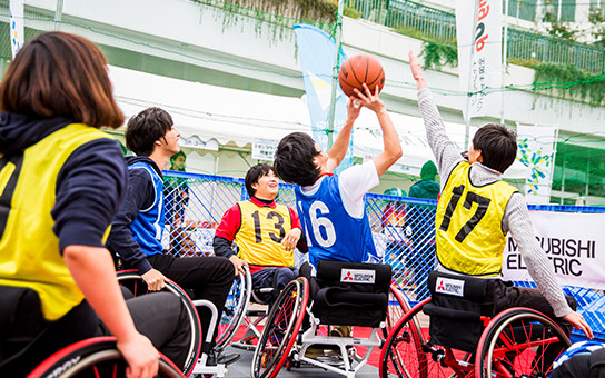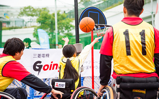 三菱電機では、東京2020大会とその先の社会における共生社会の実現に向けて、車いすバスケットボールをはじめとする障がい者スポーツなどを幅広く一般の方々に参加していただき、これらのスポーツをより多くの方に身近に感じていただくプロジェクト「三菱電機 Going Up キャンペーン」を行っています。