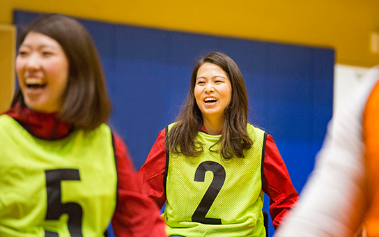 後半は、試合形式で体験しました。まずは、選手2人に対して私たち4人で挑戦。試合が始まると、選手たちの動きについていけず、圧倒的なスピードを目の当たりにしました。その後、選手1人と私たち2人でチームを作っての3対3も行いました。パスをしたりシュートをしたり、時間が経つのを忘れるほど楽しむことができました。難しい分、シュートを決めた瞬間はとても嬉しかったです!