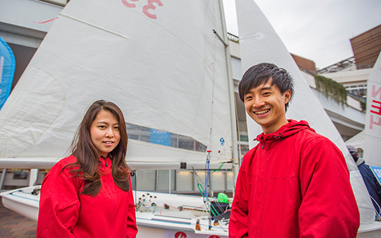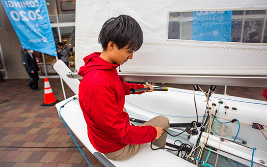 最初に私たちが体験したのは、セーリング。本物の船を見ながら、操舵の仕方を教えていただきました。この競技は体格や力の強さだけでなく、選手2人が力を合わせながら風を読む戦略とテクニックが必要だという話を聞き、自然を相手にするセーリングという競技の面白さや難しさを実感できました。