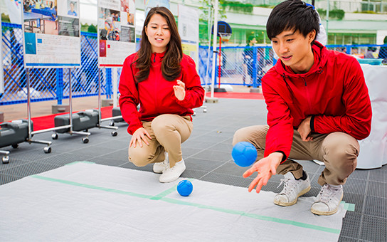 この他、ボルダリングやブラインドサッカー、ボッチャを実際に体験しました!ボッチャはヨーロッパで生まれたパラリンピックの正式種目です。目標となる白いボール(ジャックボール)に赤、青のボールを投げてどれくらい近づけるかを競うという、カーリングに少し似たユニークな競技です。ゲーム形式で体験させてもらいましたが、実際にやってみると力加減は難しかったのですが、楽しく体験できました。