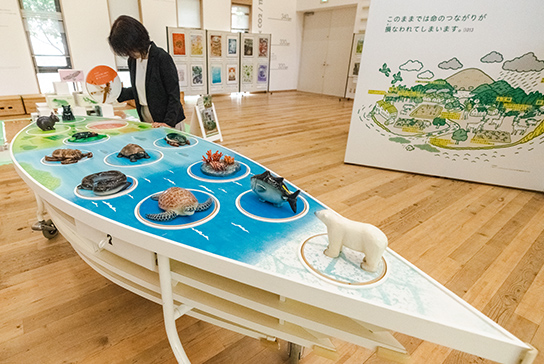 かごしま環境未来館は、鹿児島市の環境学習や環境保全活動の拠点で、環境問題を紹介する館内展示をはじめ、環境関連の講座やイベントも開催しています。4つのゾーンに分かれた展示スペースでは、映像だけではなく、手に取って動かしたり、見て触れて体感したりする体験型の展示など、誰もがわかりやすく気候変動や生物多様性を学べます。建物の屋上は、芝生によって緑化され、太陽光発電パネル、雨水を散水や清掃に利用する雨水貯水タンクを完備するなど、環境に配慮した建物となっています。電気自動車普及促進のための急速充電スタンドも設置、公用車として活躍する燃料電池自動車も待機しています。燃料電池自動車は、水素と酸素の化学反応で発生する電気で走り、排出されるのは水のみ。「ミライとイキル」がコンセプトの環境にやさしい乗り物として、ブルーの爽やかなデザインがペイントされた特徴的な一台です。