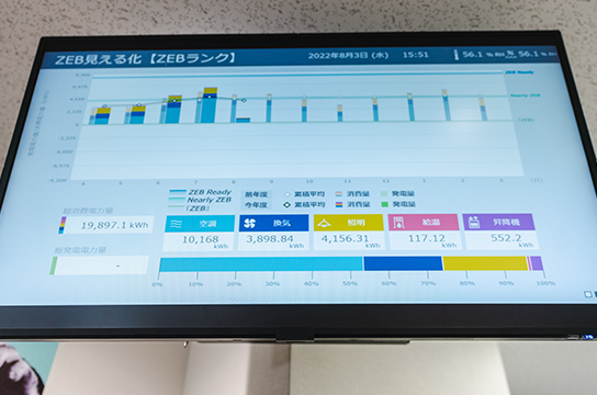 久永/社員も快適な環境に満足しています。夏の時期はエアコンを稼働しますが、4〜6月は、「ロスナイ」で効率的に熱交換し、換気だけで十分快適に過ごせました。外壁を高断熱化しているので、保温性がいいのでしょうね。照明もトイレや階段は人感センサーで電気の無駄を省き、エレベーターでは電力回生装置で、高い省エネレベルを実現出来ていると思います。また、これら設備を「BEMS(Building Energy Management System)」によってエネルギーをすべて“見える化”し、管理しているので一目瞭然です。電気代は昨年の半分で済みました。社員の省エネルギーへの意識も高まっています。お客様にも、当社の省エネルギーの仕組みや地球温暖化対策への貢献について、紹介しています。