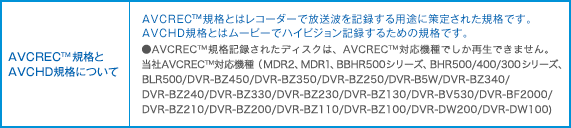 ※1 2011年11月現在、BD-R 128GBは発売されていません。 ※2 他社レコーダーのVR方式で録画されて、カートリッジからディスクを取りだせるもののみ再生可能。※3 AVCREC方式(AF/AN/AEモード)のみ記録可能。【推奨ディスクについて】本機の性能を充分に発揮するため、次のメーカー製ディスクの使用をおすすめします。(2011年11月現在)ただし、推奨メーカー製のディスクであっても、動作を保証するものではありません。 <DVR-BZ450/BZ350/BZ250の推奨ディスク> ●BD-RE…SL(1層):パナソニック DL(2層):パナソニック ●BD-R…SL(1層):パナソニック DL(2層):パナソニック TL(3層):パナソニック、TDK ●DVD-RW…4倍速:三菱化学メディア ●DVD-R…SL(1層)16倍速:That's DL(2層)8倍速:三菱化学メディア