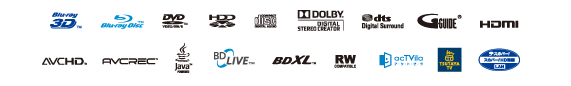 ●"Blu-ray DiscTM(ブルーレイディスクTM)""Blu-rayTM(ブルーレイTM)""Blu-ray 3DTM(ブルーレイ3DTM)""BD-LIVETM""BDXLTM""AVCRECTM"およびロゴは、ブルーレイディスク アソシエーションの商標です。●Dolby、ドルビーおよびダブルD記号はドルビーラボラトリーズの登録商標です。 ●DTSはDTS, inc.の登録商標です。DTSのロゴ及びシンボルマークは米国DTS,Inc.の商標です。●ロヴィ、Rovi、Gガイド、G-GUIDE、およびGガイドロ ゴは、米国Rovi Corporationおよび/またはその関連会社の日本国内における商標または登録商標です。 ●HDMI、HDMIロゴ、およびHigh-Definition Multimedia Interfaceは、HDMI Licensing LLCの商標または、登録商標です。●"AVCHD"および"AVCHD"ロゴはパナソニック株式会社とソニー株式会社の商標です。●OracleとJavaは、Oracle Corporation及びその子会社、関連会社の米国及びその他の国における登録商標です。