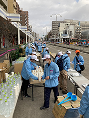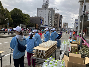 参加したボランティアスタッフは、12.5km給水地点で2チームに分かれ、ランナーの水分補給をサポートしました。当日は天気も良く、マラソン日和の中たくさんのランナーが給水を求めて次から次へと走ってくるため、作業は大忙し。朝早い時間からの活動でしたが、あっという間に活動が終わり、大きな達成感を得られることができました。給水所のボランティアスタッフはコース内で活動を行うため、ランナーと距離が近く、随時声援を送りながら精一杯活動を行いました。