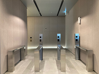 オフィスエレベーターでは、入口に設置した顔認証システム(※2)とエレベーター行先予報システム「エレ・ナビ」の連携により、ウォークスルーでのエレベーター乗車で、目的のフロアまでタッチレスで快適な移動を可能にしています。