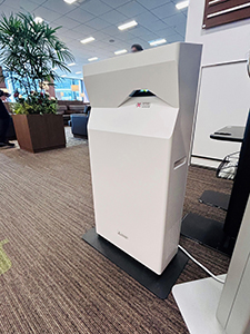 同クリニックでは、一般診療のほか、定期診断や人間ドック等も行っており、多くの来院者を診療しています。来院者の利便性と満足度を高めるため、大名古屋ビルセントラルクリニックにエントランス受付と、更衣室へ「てらすガイド」を計2台、国際セントラルクリニックのエレベータホールに「てらすガイド」を1台、受付・待合室に青空照明「misola」を計12台を設置いただきました。