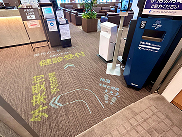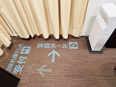 これまで同クリニックでは、受付窓口の業務に従事するスタッフが健康診断と外来受付への動線案内の対応をしていました。「てらすガイド」の導入により、床に照射される直感的でわかりやすい動くサインが受診内容によって異なる受付へ来院者をスムーズに案内し業務軽減に貢献しています。