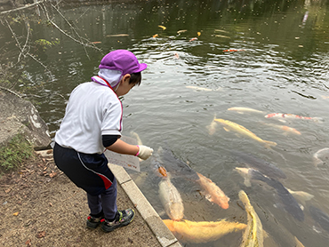当社社員が先生役となり、センター内に生息する鯉の餌やりや、ルーペを用いた植物観察等を通し、自然と触れ合うことの楽しさを学んでいただくことができました。