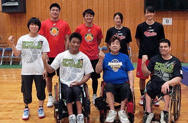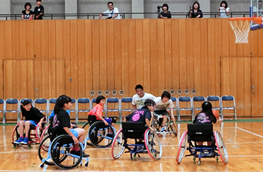 また、車いすバスケットボールチーム「札幌ノースウィンド」、「旭川リバーズ」から4名の選手を招聘し、車いすバスケットボールの体験会も併せて実施しました。体験会では、車いす操作から始め、シュート練習、ミニゲームを行いました。児童たちは車いすを上手に操り、車いすバスケットボールの楽しさを感じたことと思います。