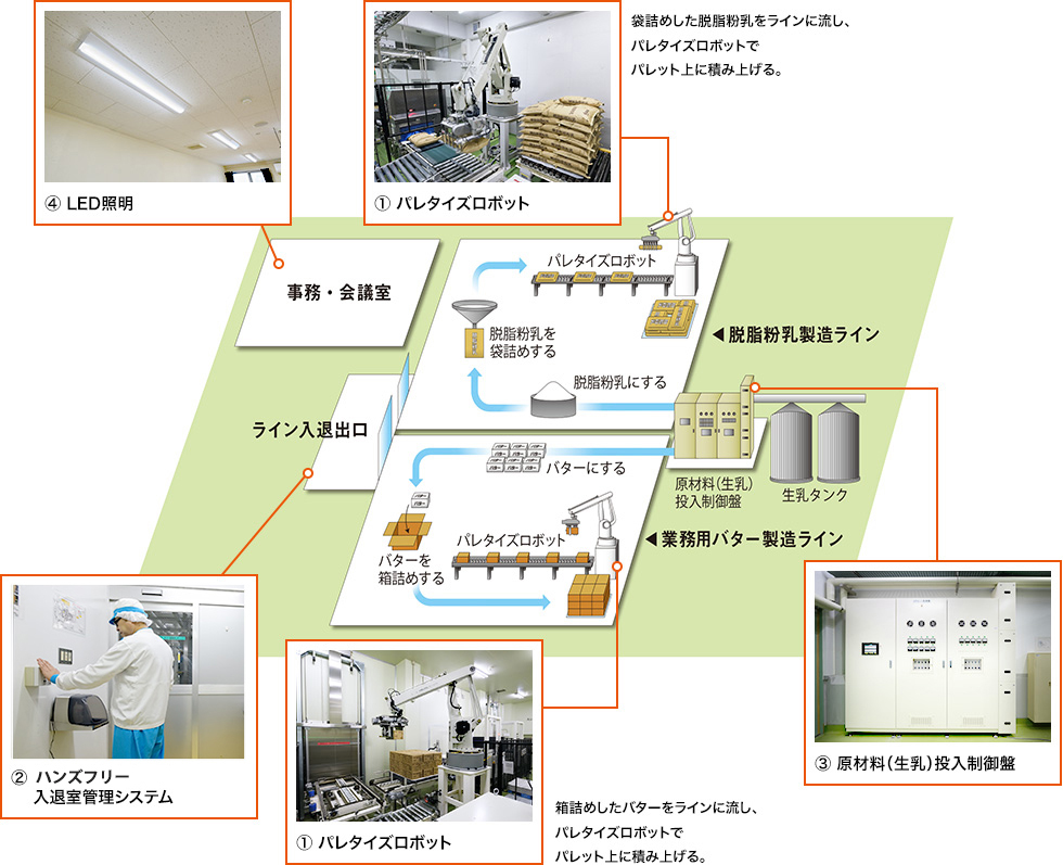 - 牛の乳は毎日出てくるので、当工場は365日24時間欠かさず操業・製造しており、工場を止める訳にはいきません。止める事ができない状況の中で、壊れず、性能の良い三菱電機製品への信頼があります。万が一不具合が起きたときは、電話1本で対応してくれるという点でも信頼しています。