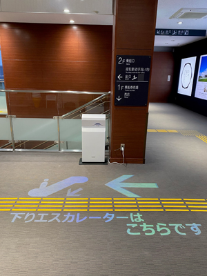 新設された2階からの下りエスカレーターの場所を下船のお客様に分かりやすく案内するため「てらすガイド」を導入いただきました。写真では下船口から下りエスカレーターまでの誘導をしています。てらすガイドから床に照射される直感的でわかりやすい動くサインにより、お客様のスムーズな誘導に貢献しています。 |