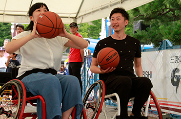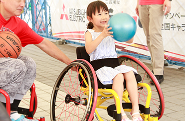 本活動の一環として、2019年7月7日(日)に富山県富山市において開催された「KNB 大バザール 2019」内で、「三菱電機 Going Up キャンペーン 全国キャラバンin 富山」を開催しました。障がい者スポーツ体験コーナーを設置し、車いすバスケットボールやボッチャの体験会を実施し、合わせて315名の方に体験いただきました。