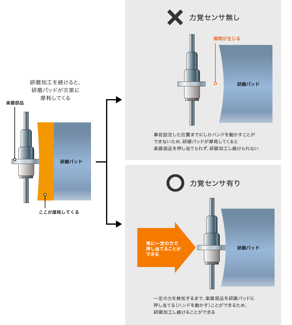 熟練した職人が楽器部品を研磨パッドに押し当てる、繊細な力加減を数値化するため、ヨシダ工業株式会社様と三菱電機グループの技術者による技術懇談を複数回にわたり実施。さらにシミュレーションの実験等を通して、力覚センサを活用した、産業用ロボットによる熟練の研磨作業の再現をご提案することで、お客様に満足いただける内容となり、導入に至りました。
