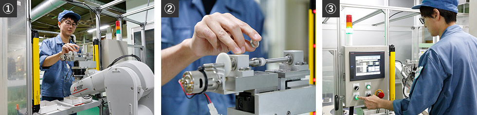 研磨する部品をロボットアームにセットした後(①②)、研磨スタートを指示(③)。