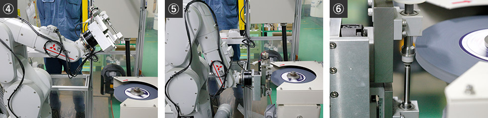 ロボットアームが自律的にアプローチし(④)、研磨パッドに部品を押し当て研磨を開始(⑤)。