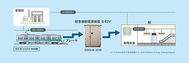 今回、『S-EIV』を導入することで近くに電車がいないときには、駅の設備等に電力を供給することができるようになり、無駄なく回生電力を利用することができるようになりました。