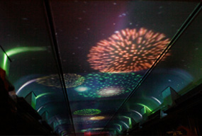 電車の天井一面に「継ぎ目のない映像」を映し出します。