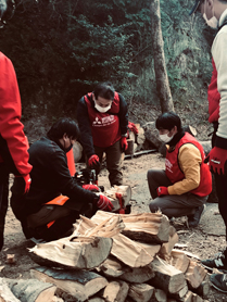 実施内容は、例年と同様の「しいたけ園」での原木整理、「水の森」での落枝落葉収集に加え、今回より新たに木製食器や焚火に使う薪作りも実施いたしました。当日は寒い冬山でしたが、生き物の偉大さや自然の循環について理解を深め、日常生活で触れ合う機会が少ない大自然の中で、他の参加者と共に汗を流すことができ、最高のリフレッシュにもなりました。今後も本活動を多くの方に知っていただき、継続して取り組んで参ります。