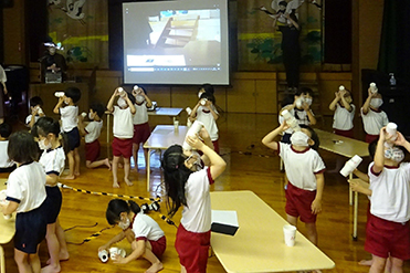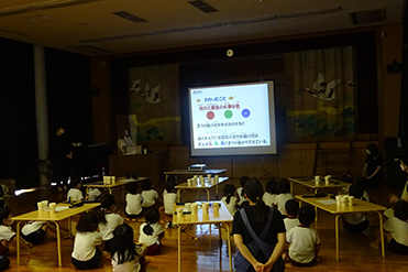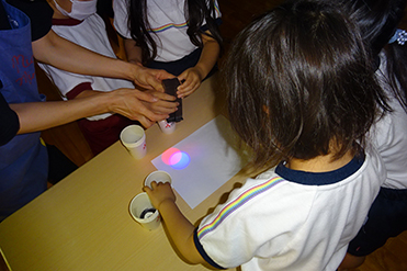 保育園の子どもたち計28名が参加し、光の三原色に関する実験や工作を通して、光の仕組みについて楽しく学びました。工作では、熱心に作成した光万華鏡から見えるキラキラした光に大きな歓声が上がりました。