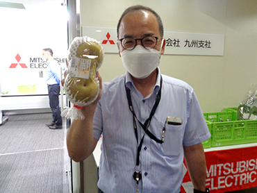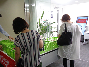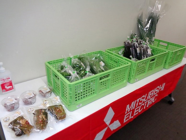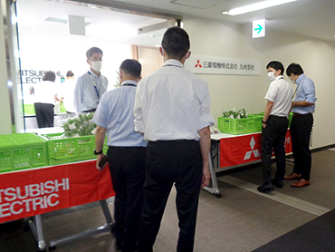 「復興支援マルシェ」とは、被災地の物産品を購入することで、地域産業・経済活動の活性化を支援する活動です。2017年7月5日に発生した九州北部豪雨災害に対する継続支援や風化防止を目的として、福岡県朝倉市の道の駅より仕入れた色鮮やかで新鮮な夏野菜と果物、人気の加工品などを社内販売しています。