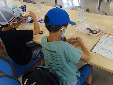 今回のテーマは「~風と羽の不思議な関係~」で、ペットボトルを使った工作で風力発電のしくみを学んでもらいました。羽の形や枚数で生み出せる電気量が異なるため、子供たちはどうすれば多くの電気を生み出せるか自分で考えながら風力発電機を作っていました。