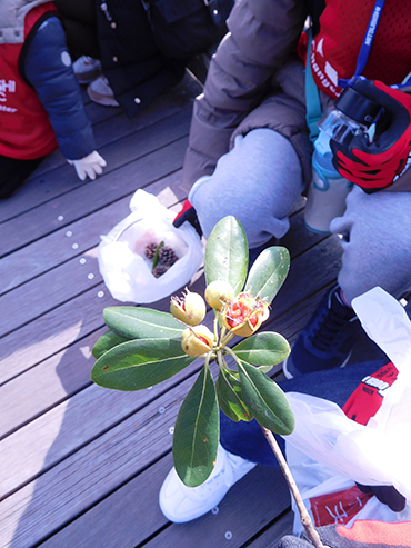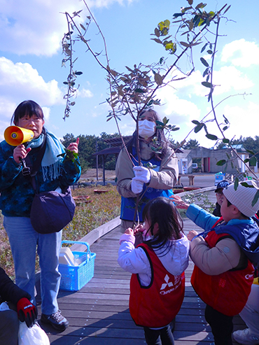 並行して小学生以下のお子さんを対象に野外教室を実施し、気温等の条件が合致しないと実が破裂しない「トベラ」を破裂した状態で観察できました。お子さんたちの笑顔がとても印象的でした。