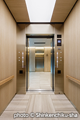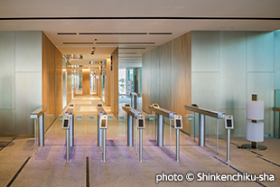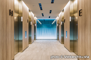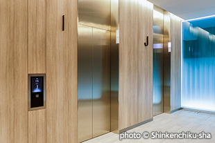 オフィス用エレベーター12台は、行先予報システム「エレ・ナビ」に対応。セキュリティーゲートとの連動でIDカードをかざすだけのタッチレスでの入場を可能とし、目的階への快適な移動を実現しました。また、オフィスエントランスに設置された来訪者受付機の操作パネルに、空中ディスプレイを採用。タッチレスでの入館登録を可能とし、来訪者に安全・安心を提供しています。