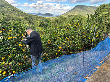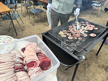 午後からは、王越のまちづくりの会の方より、深刻化しているイノシシによる農作物被害や農業の担い手減少の現状などについてお話を伺い、駆除されたイノシシ肉をバーベキューで味わったり、獣害対策が施されたみかん畑でのみかん狩りで、町の賑わいづくりに貢献しました。