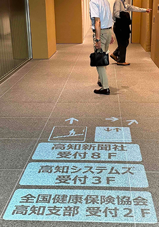 エントランスホールには、「てらすガイド」を設置いただき、入口自動ドアの開閉と連動して館内案内(光のアニメーション)を床面に照射し、ビル利用者の円滑な移動を支援しています。