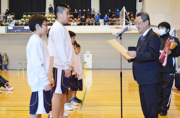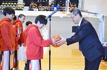 小学校1~5年生の男子70チーム、女子57チームが出場した今大会。その頂点を決めるにふさわしい白熱した試合が繰り広げられました。閉会式では当社・荒木支社長から賞状・カップの贈呈とともに、選手たちへ激励の言葉を掛けさせていただきました。また、上位入賞チームへは副賞として、三菱電機住環境システムズ株式会社東北支社よりバスケットボールをお贈りいたしました。