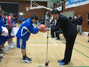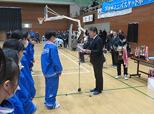 東北支社が2012年から協賛する「三菱電機カップ 第41回宮城県ミニバスケットボール新人大会」(主催:宮城県バスケットボール協会)の準決勝・決勝戦が2024年2月23日(金・祝)に女川総合体育館(宮城県女川町)で開催されました。小学校1~5年生の男子76チーム、女子68チームが参加し、当日は勝ち残ったチームによる熱戦が繰り広げられました。閉会式では、東北支社長・田中準二より優勝杯と賞状を贈呈し、選手たちに激励の言葉をかけさせていただきました。また、上位入賞チームへは副賞として、三菱電機住環境システムズ株式会社東北支社よりバスケットボールをお贈りいたしました。