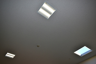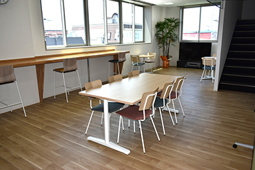太陽光発電を屋上に配置、寒冷地向けで省エネ率の高い事務所用スリムエアコンの採用等を実施し、建物全体の省エネ化及び低コスト化を実現。正面玄関入口付近に設置したサイネージでは今現在の消費電力量を確認でき、お客様に見ていただくことでZEBのPRをしています。1階の正面玄関から2階への階段の天井には青空照明misola(みそら)を採用し、開放的で奥行き感のある青空を模したパネルと自然な太陽光を表現するフレームを組み合わせた独自構造により、室内空間で奥行きのある青空と自然な光を表現しています。また、従業員が健康的に働くことができる環境を提供する「ウェルネス」への取組みも実施しており、2階オフィス奥にリフレッシュコーナーを配置し従業員の方々がちょっとした休憩に利用いただくことでストレスや肉体的な疲労を癒す場所となっています。