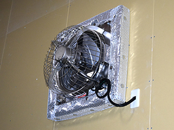 1階の倉庫は空調設備を設置せず大風量の有圧換気扇を採用。
