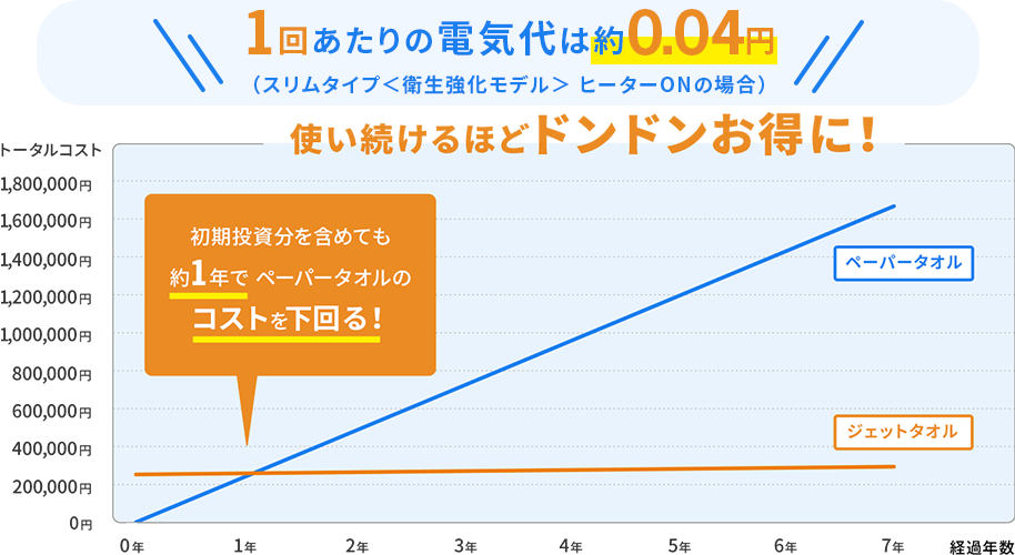 1回あたり、約0.04円。電気代のみの維持費で経費を削減。月々の維持費はわずかな電気代だけでOKなので、コストの大幅な削減に役立ちます。