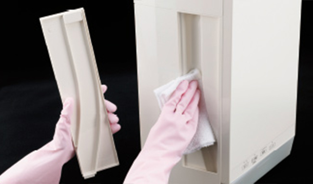 ホースレスで簡単に清掃できるドレン水路。全面パネルもフィルターも簡単に取り外しができ楽々メンテナンス。全面抗菌加工※1+アルコール※2拭き掃除も可能で衛生的。