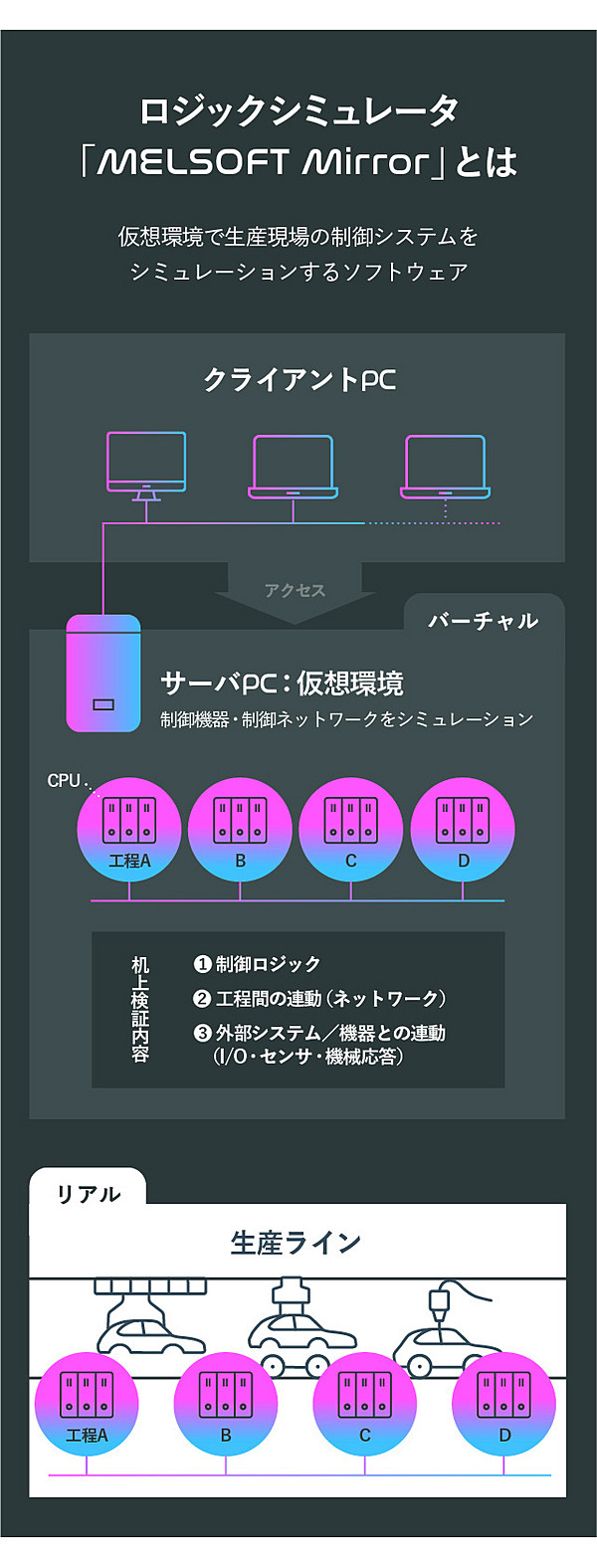 こうした背景を踏まえ、三菱電機は2024年からロジックシミュレータ「MELSOFT Mirror(メルソフト ミラー)」の提供を開始した。