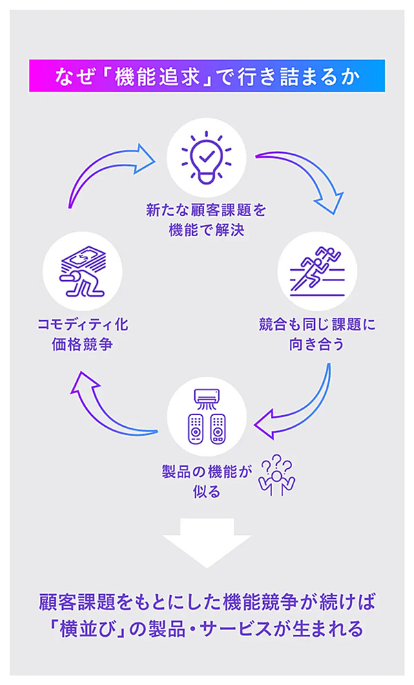 エアコンを例に挙げると「部屋が暑い・寒い」という課題を「涼しくする・暖かくする」機能で解決した結果、各メーカーの製品は横並びになった。利便性を追求したアップデートは続いているが、その方向性も似てしまい、また横並びになってしまう。ユーザーも違いが分からない。