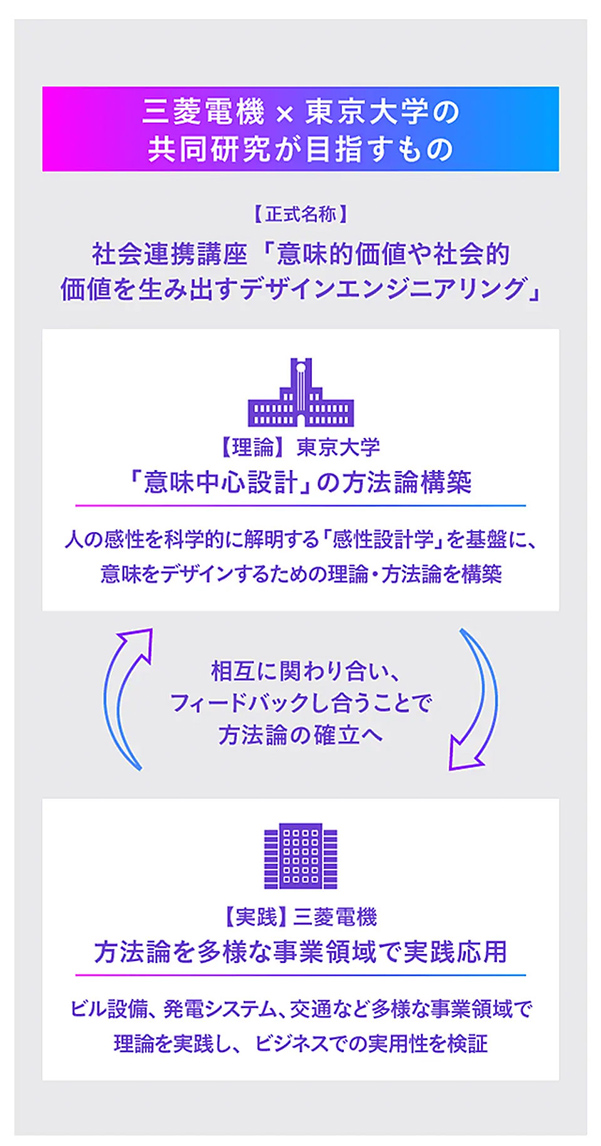 この問題を突破しようと、三菱電機と東京大学は「意味中心設計」という新しいアプローチの確立に挑んでいる。顧客課題や機能だけではなく、人や社会にとっての「意味」を起点に、製品・サービスをデザインするのだ。
