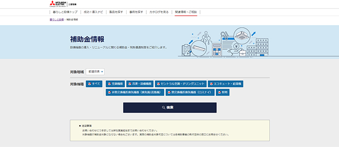 換気設備の導入には自治体の補助金が支給される場合があります。設備機器の導入・リニューアルに関わる補助金・税制優遇制度をご紹介する「補助金情報」サイトをご覧ください。