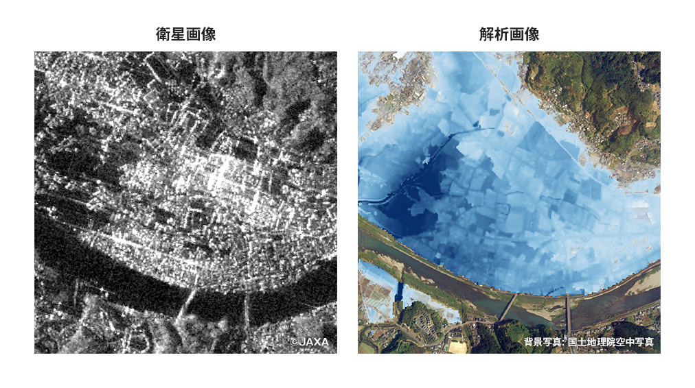 レーダ衛星の画像は白黒で、医療機器のエコーで体内の赤ちゃんや臓器を写したようなもの。そのままでは何が写っているかわかりにくい。そこで衛星観測ソリューション部門では、例えば水害の事例では水害の範囲に着色したり、地図と重ね合わせたりして「この部分が浸水している」といった情報が一目でわかるように加工し、提供している。