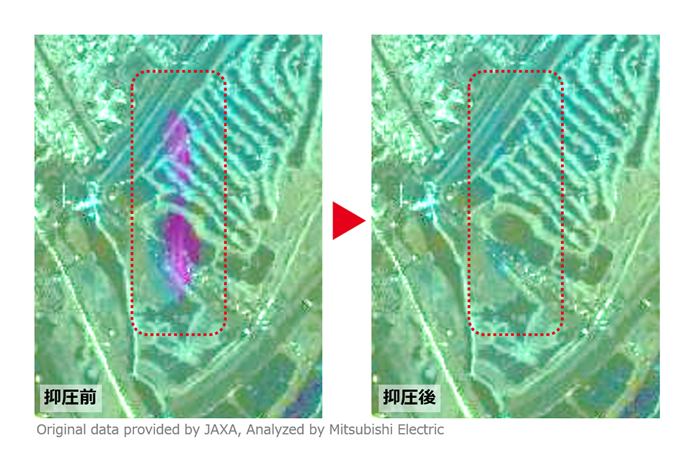 三五:三菱電機は、衛星画像の解析処理や加工処理に関していくつかの特許を取得しています。その1つが「ノイズ除去」に関する特許です。レーダで地表を撮影すると、都市などが発する強い信号がノイズとして入り込むことがあります。そうしたノイズを除去して、本来見たかったものを見やすくしたり、地盤変動モニタリングの解析結果の精度を向上させる技術です。