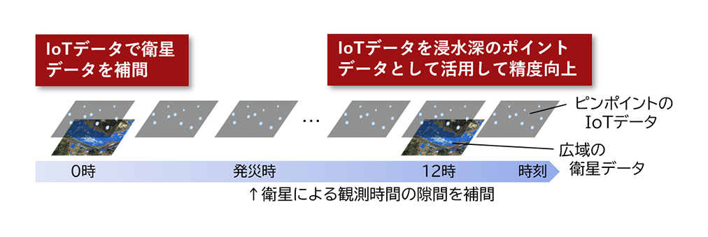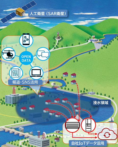 三菱電機も衛星データを活用した新製品やサービスの開発に取り組んでいる。その1つがIoT家電との連携だ。例えば洪水が起き、家庭用エアコンの室外機が水に浸かると、それを知らせる信号がメーカーに送られる。それを集約し、衛星データと照合すれば、浸水状況を広域かつより詳細に把握できる。