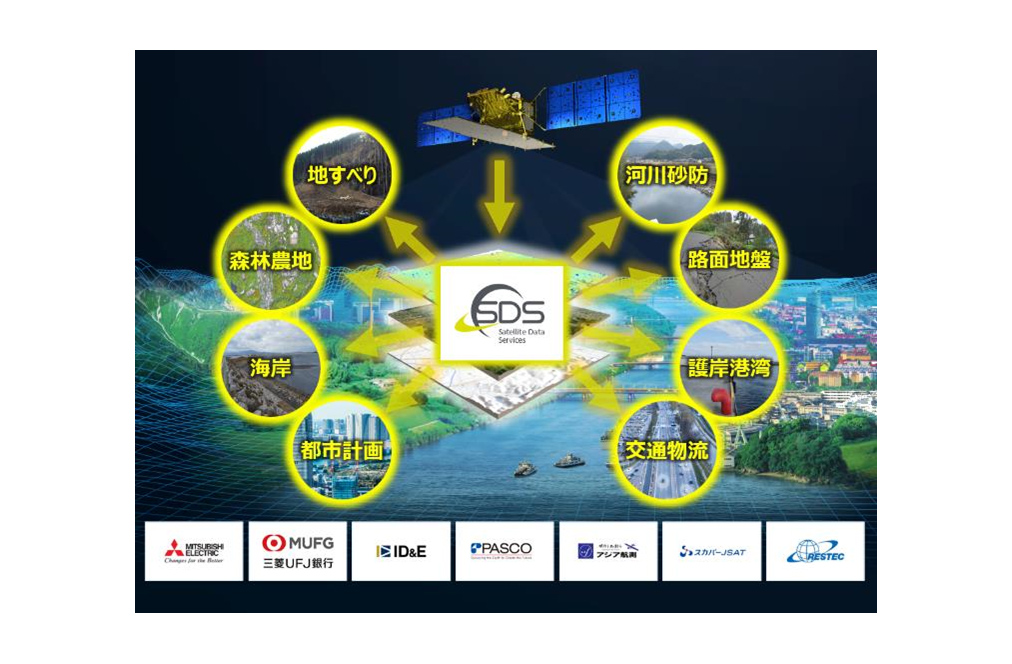 2021年6月、三菱電機は、ID&Eホールディングス、株式会社パスコ、アジア航測株式会社、スカパーJSAT株式会社、一般財団法人リモート・センシング技術センターとともに、「衛星データサービス企画株式会社(以下、SDS)」を設立した。2024年2月には三菱UFJ銀行もSDSの出資企業に加わっている。SDSは、幅広いユーザーに衛星データ解析情報を提供し、衛星データの利活用を推進するスタートアップだ。三菱電機とSDSは内閣府のBRIDGEプログラム(※3)の1つ、「日本版災害チャータ(※4)の構築とその運用・実証・実用化に関わる研究開発」に共同で応募し、採択された。また2024年4月には、SDSは小型SAR衛星のスタートアップQPS研究所らとともに国土交通省「中小企業イノベーション創出事業(SBIR)」の補助事業に応募して採択された。上限3.3億円の交付金を得て、2028年3月までの期間中にSAR衛星データを活用して、浸水・土砂災害支援システムの構築、道路点検支援システムの構築に取り組む。
