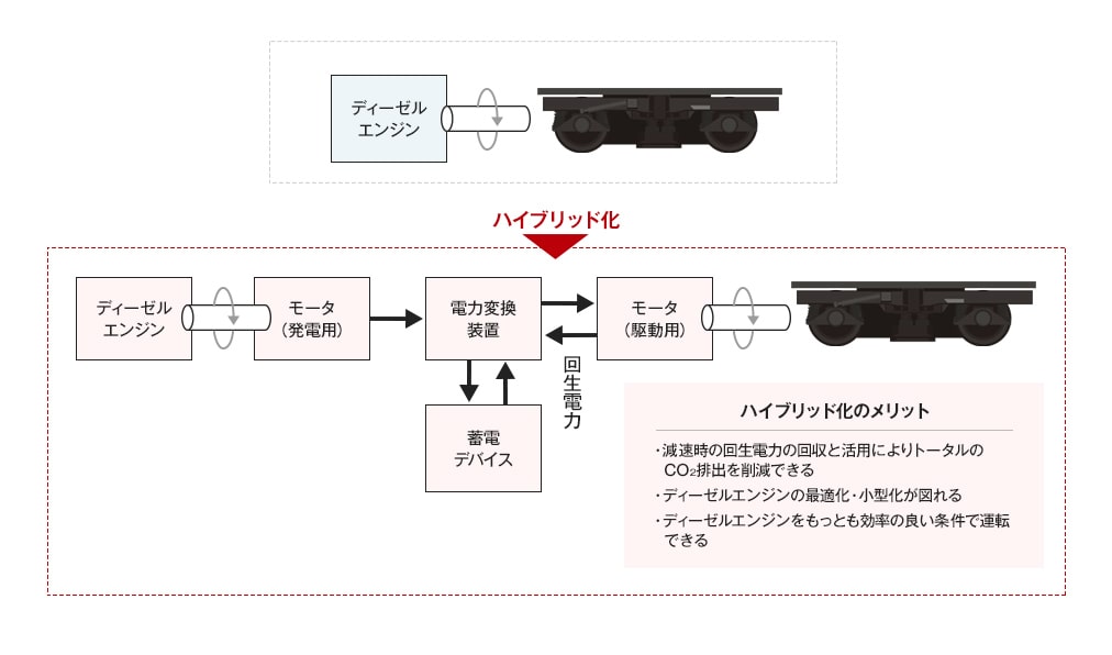 吉田:ディーゼルエンジンで走る気動車のハイブリッド化は、CO2排出削減に有効です。ディーゼルエンジンで発電機を回し、その電力を使ってモーターで車両を駆動することで、減速時のエネルギーを回収し、バッテリーに蓄えて加速に利用できます。また、停車中や低速走行時にはエンジンを停止できるため、CO2の排出をさらに削減することができます。