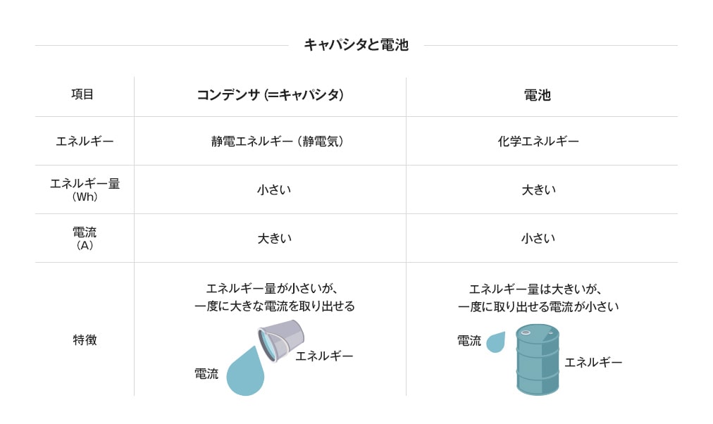 リチウムイオンバッテリーを含むバッテリーは化学反応を利用した蓄電デバイスだ。多くのエネルギーを貯蔵できる一方で、大きな電流を瞬間的に取り出すのは得意ではない。一方、キャパシタは物理反応を利用した蓄電デバイスで、貯蔵できるエネルギーは小さいが、大きな電流を瞬間的に取り出すことができる。しかも化学反応ではないため劣化がなく寿命も長いのが特徴だ。