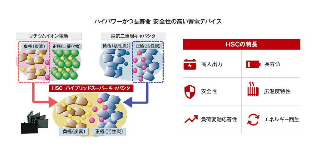 ハイブリッドスーパーキャパシタについては後述するが、蓄電デバイスの一種であり、電子回路に使われるコンデンサの超大容量版と考えればいいだろう。